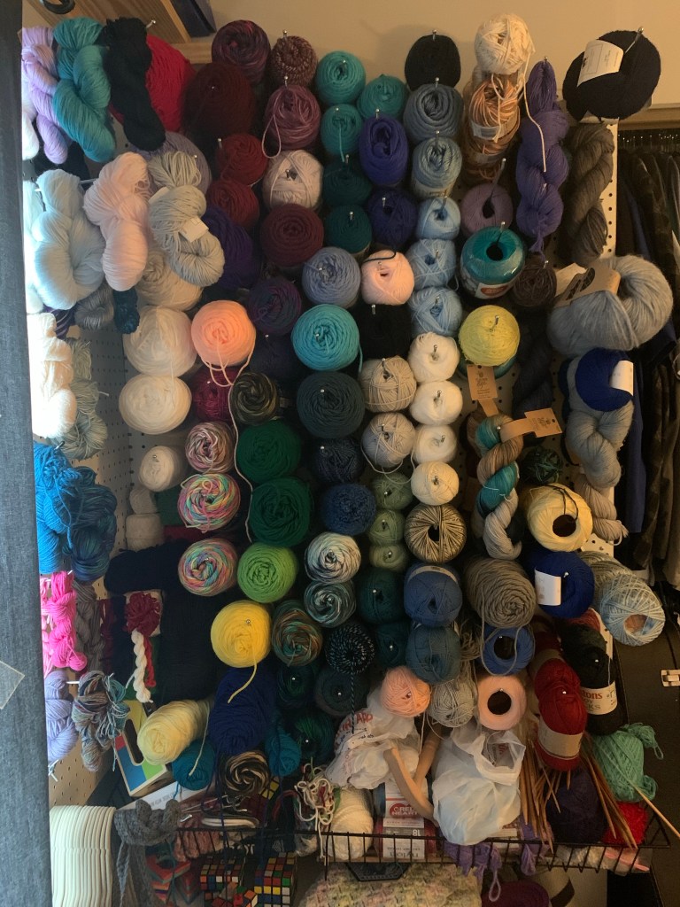 Separate out yarn weight and fiber. I have mostly worsted yarns but I’ve got quiete a few fingering weight. This is most of what I use. I have a lot of assumed acrylics that my relatives got from yard sales. I through away yarn that wasn’t good. Really rough, stained, or falling apart. The rest went up on my yarn board. (Shown below). On the left by the window are my leftover yarn. After I finish a project I take the scraps and wrap them into hanks.